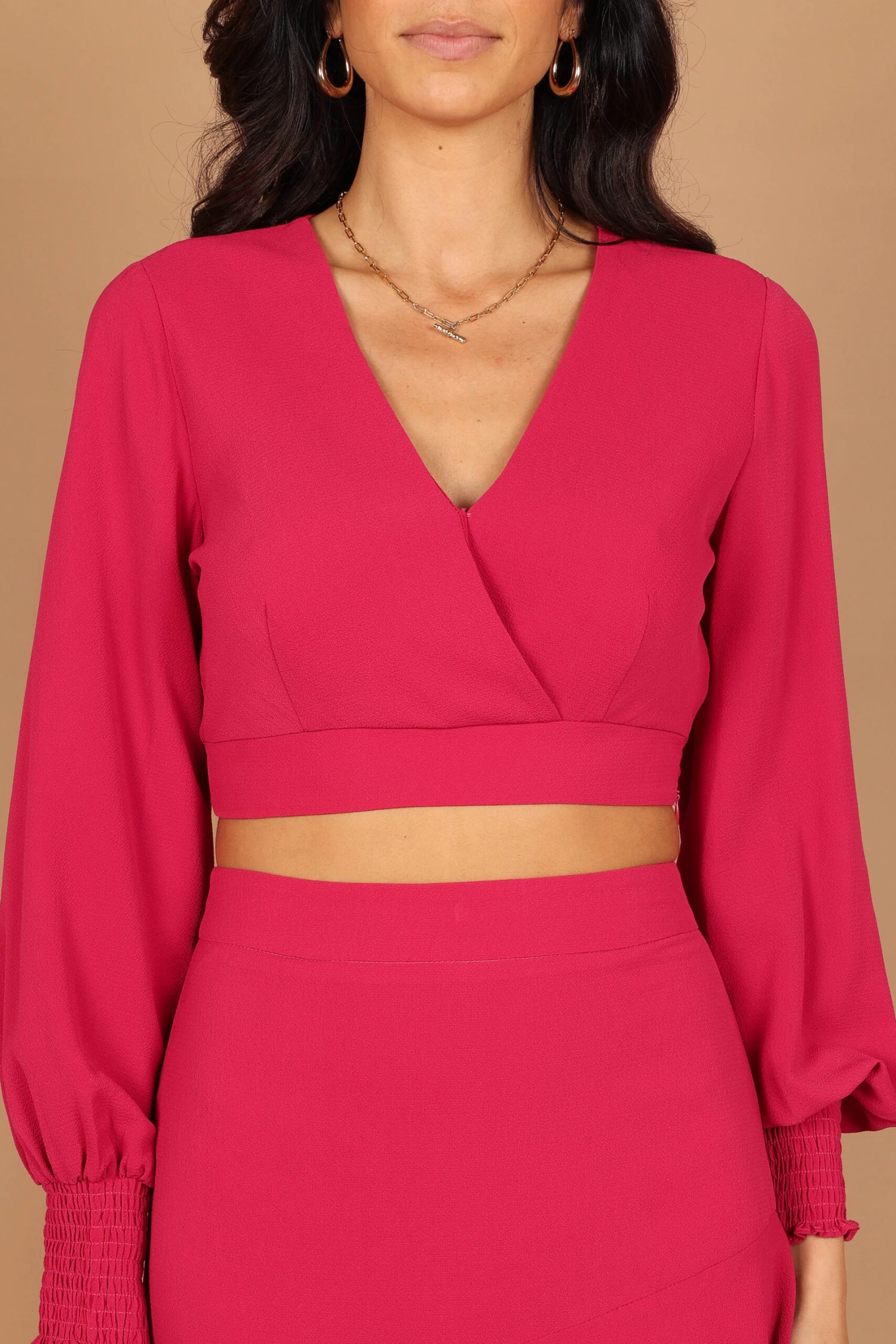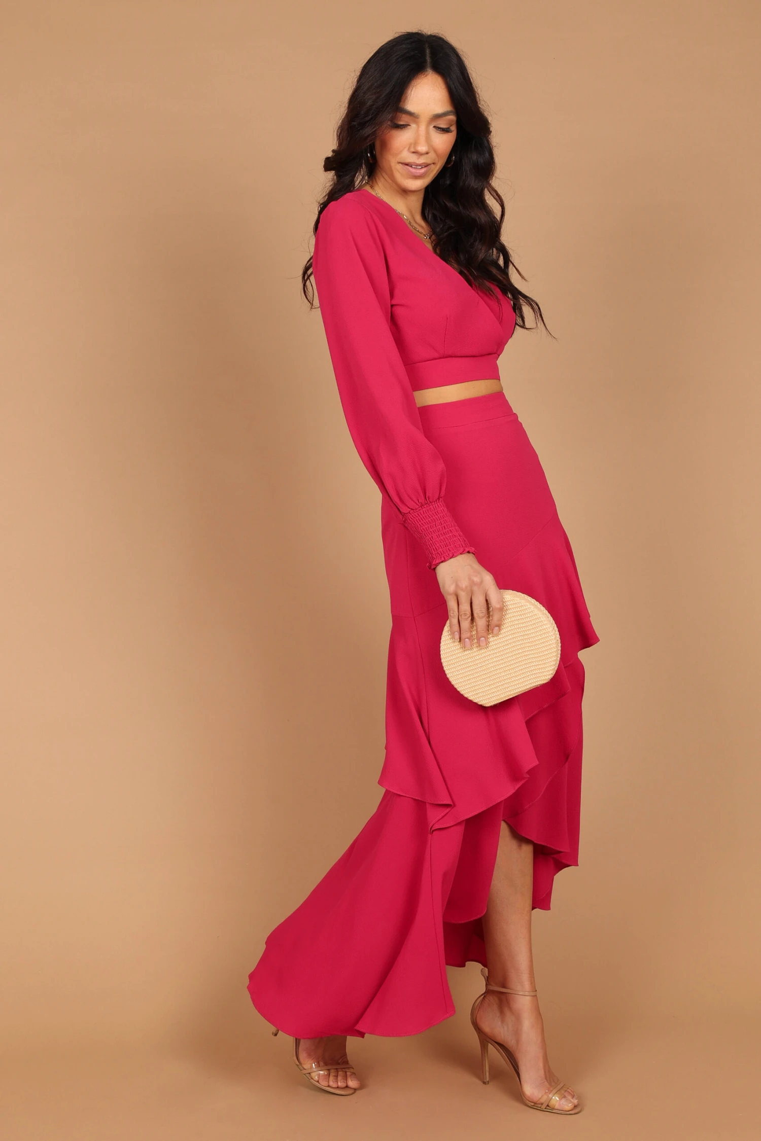 | DETAILS Be ready to make a statement in this two piece set. Featuring a cropped length top, with a v overlay neckline and long sleeves with elasticised cuff, you’ll be sure to stand out in the crowd. The elasticised waist band offers an adjustable fit for ultimate comfort, while an invisible side zip completes the look.