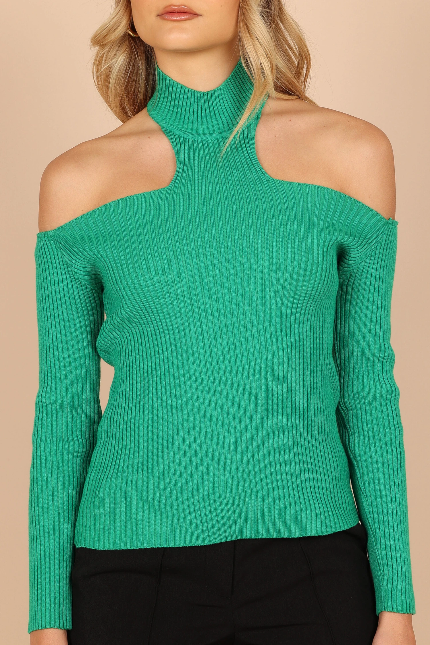 | DETAILS This cute knitwear sweater will have you looking stylish and flirty in no time! Its high halterneck neckline, elasticised off the shoulder design, long sleeves and shoulder cut out detail create a look that is perfect for any occasion. The stretch ribbed knit material makes it super comfy to wear, so you can feel cute and confident all day long.