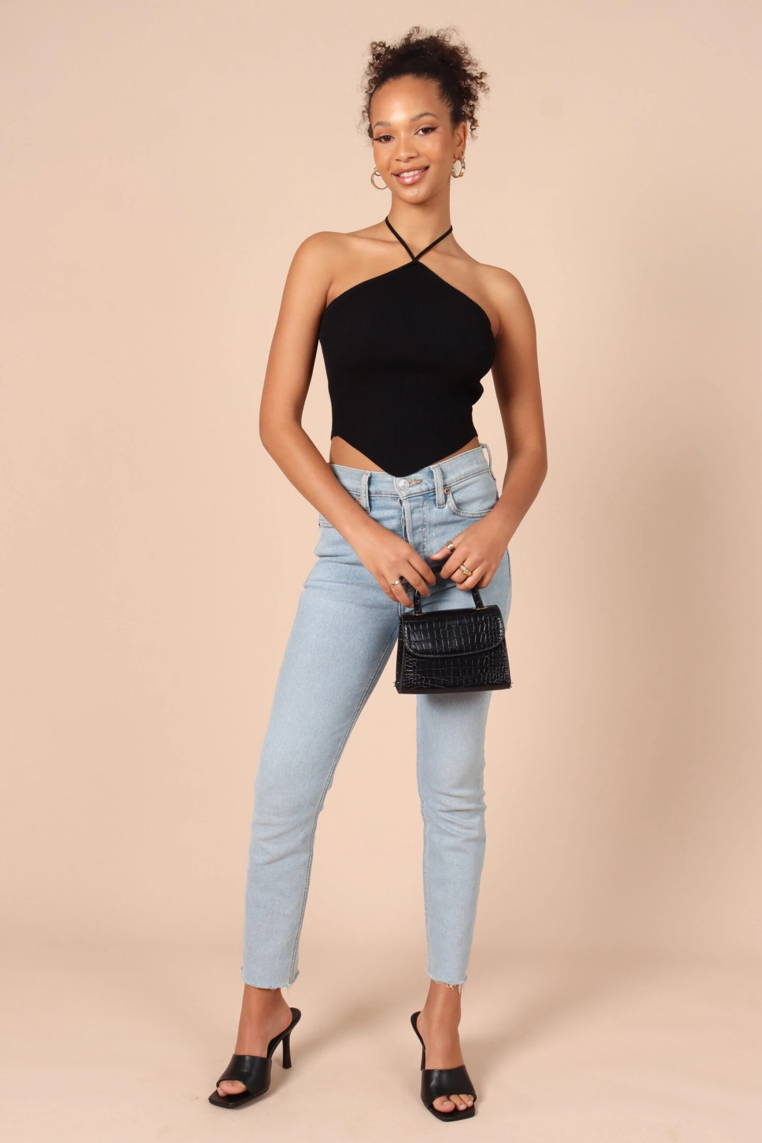 | DETAILS This halter tie crop top is sure to add a flirty touch to any look! Featuring a flattering curved hemline, it’s made from a stretchy ribbed knit that moves with you.