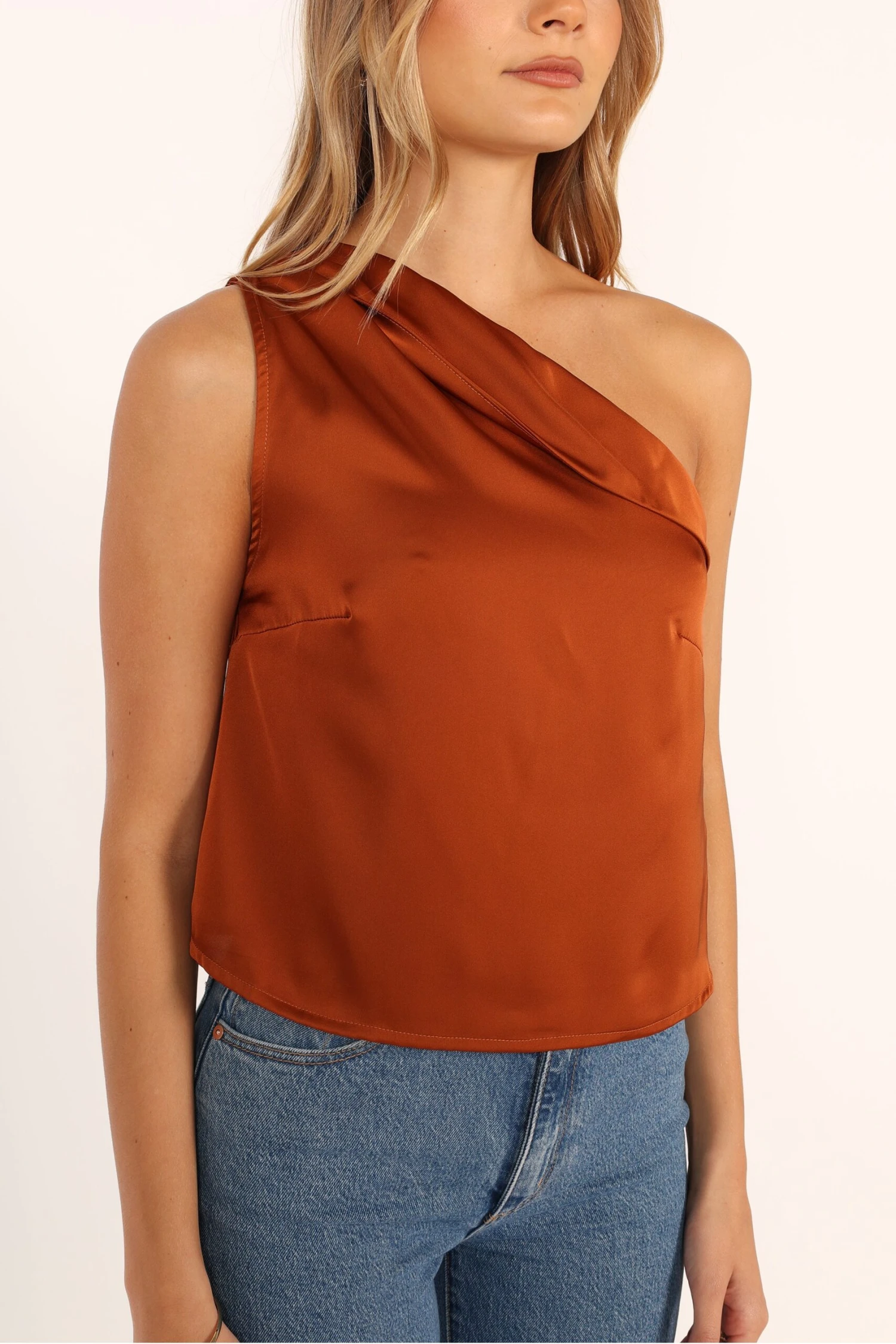 | DETAILS Introducing the perfect summer top: this rust-hued one shoulder cropped top. Featuring an asymmetrical neckline with a pleated gathered detail and crafted from a soft satin feel fabric, it’s designed for ultimate comfort and style.