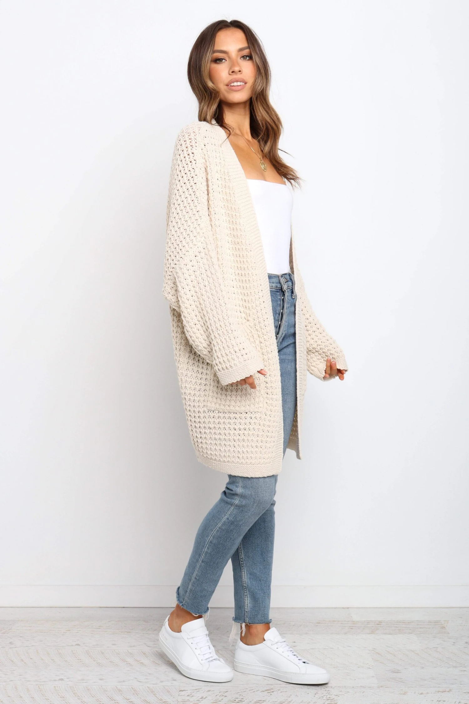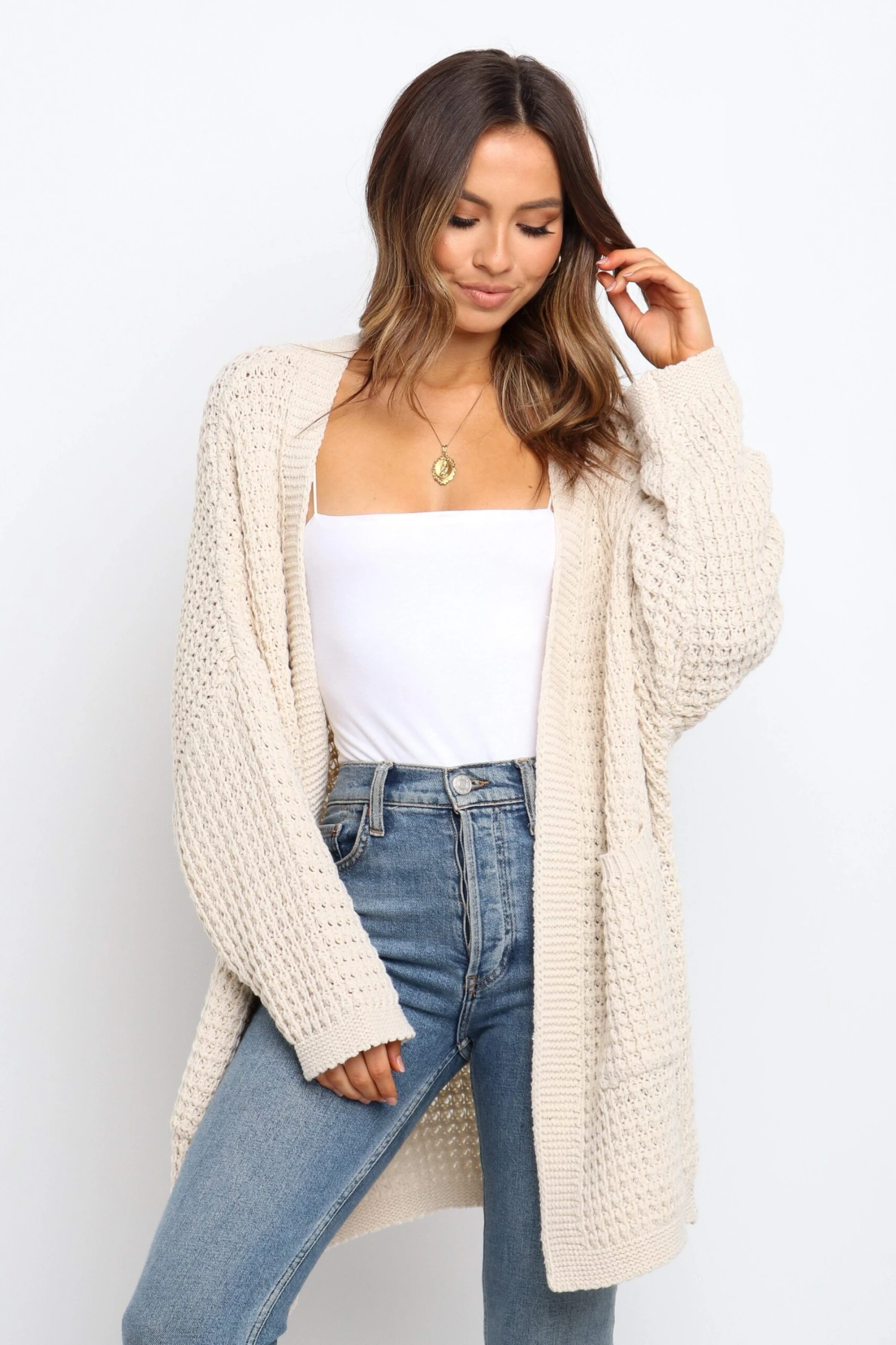 | DETAILS This long line open front cardigan is the perfect piece for those days when you want to feel extra cozy. Its knitted design gives it a stylish edge, while the two front pockets make it practical.