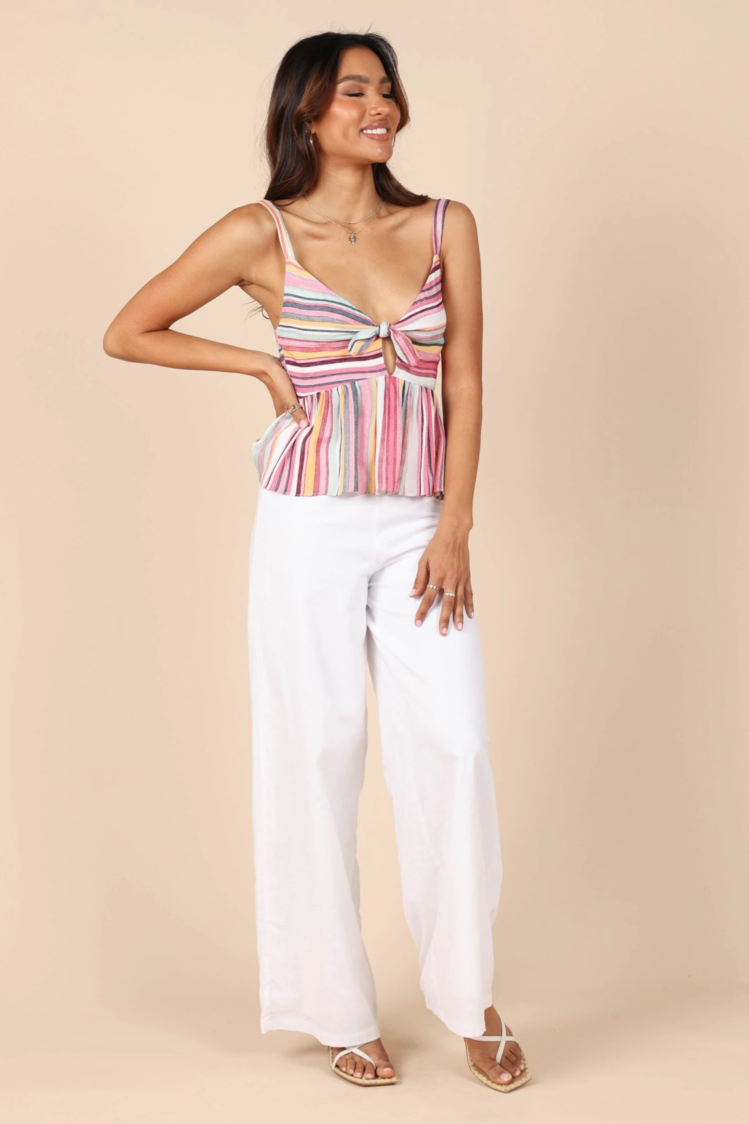 | DETAILS The peplum style top has never looked so chic! With a beautiful stripe print design and flatteringly thin adjustable straps, this is the perfect top to make a statement this summer.