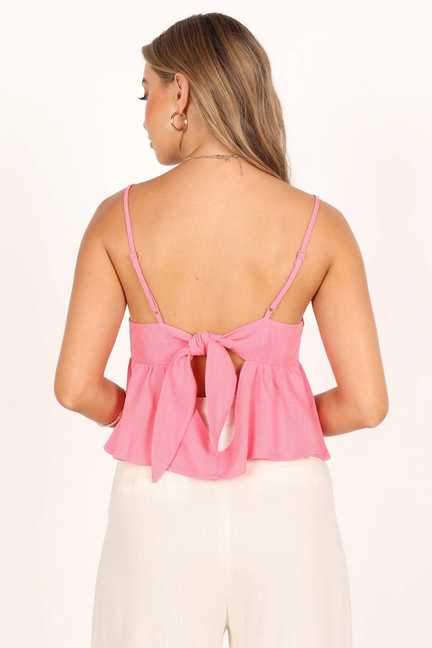 | DETAILS This cropped peplum top is the perfect way to show off your flirty style! Crafted from linen, this top features a cropped length and flattering V neckline with thin adjustable straps. It’s finished with a back tie closure for an extra touch of detail, as well as a back cut out feature that adds some sassiness to this already fun piece.