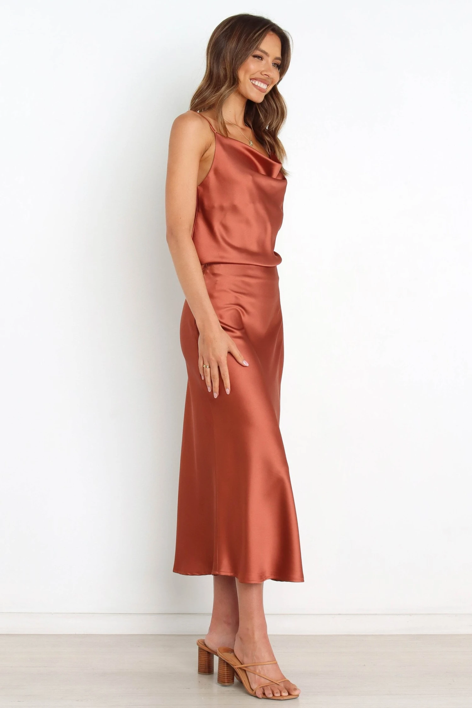 | DETAILS This gorgeous cowl neckline top is the perfect addition to your wardrobe! Crafted with thin adjustable straps and a silky satin feel, you’ll be sure to make a statement.