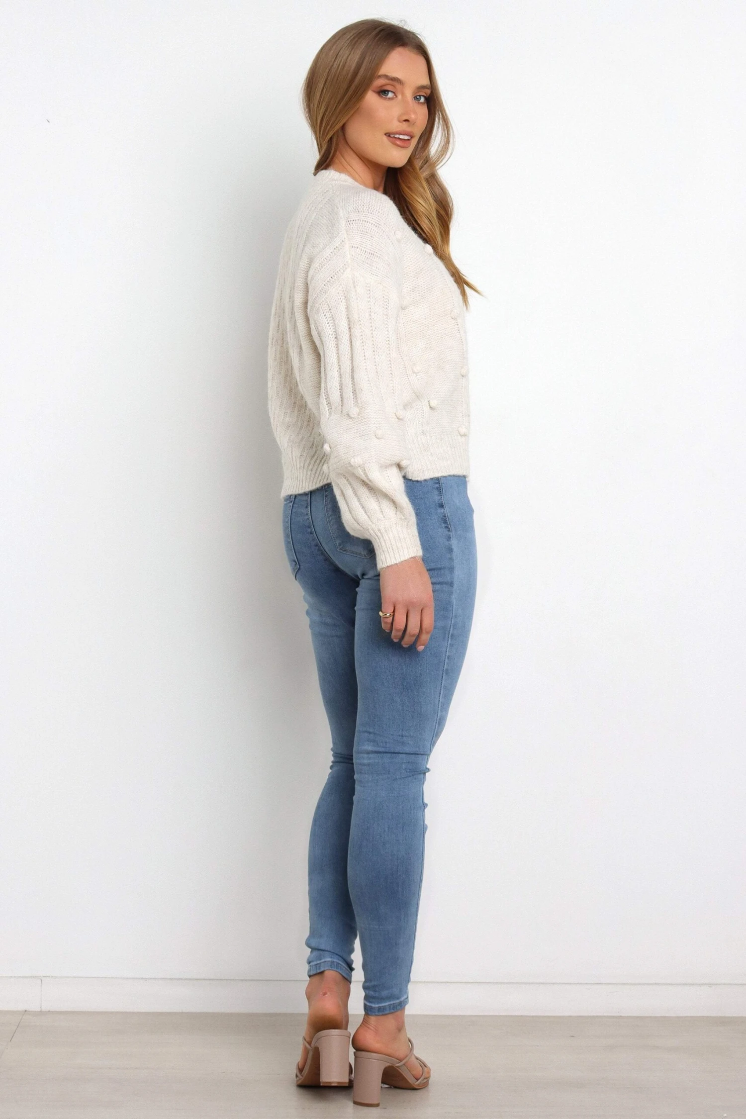 | DETAILS Are you looking for a knitwear sweater that’s cute enough to turn heads, but warm and cozy too? Look no further than this adorable knitwear sweater! With its ribbed round neckline, long sleeves with ribbed cuffs, cropped length, textured knit patterns, knit pom pom details, and soft knit construction – it’s the perfect winter warmer.
