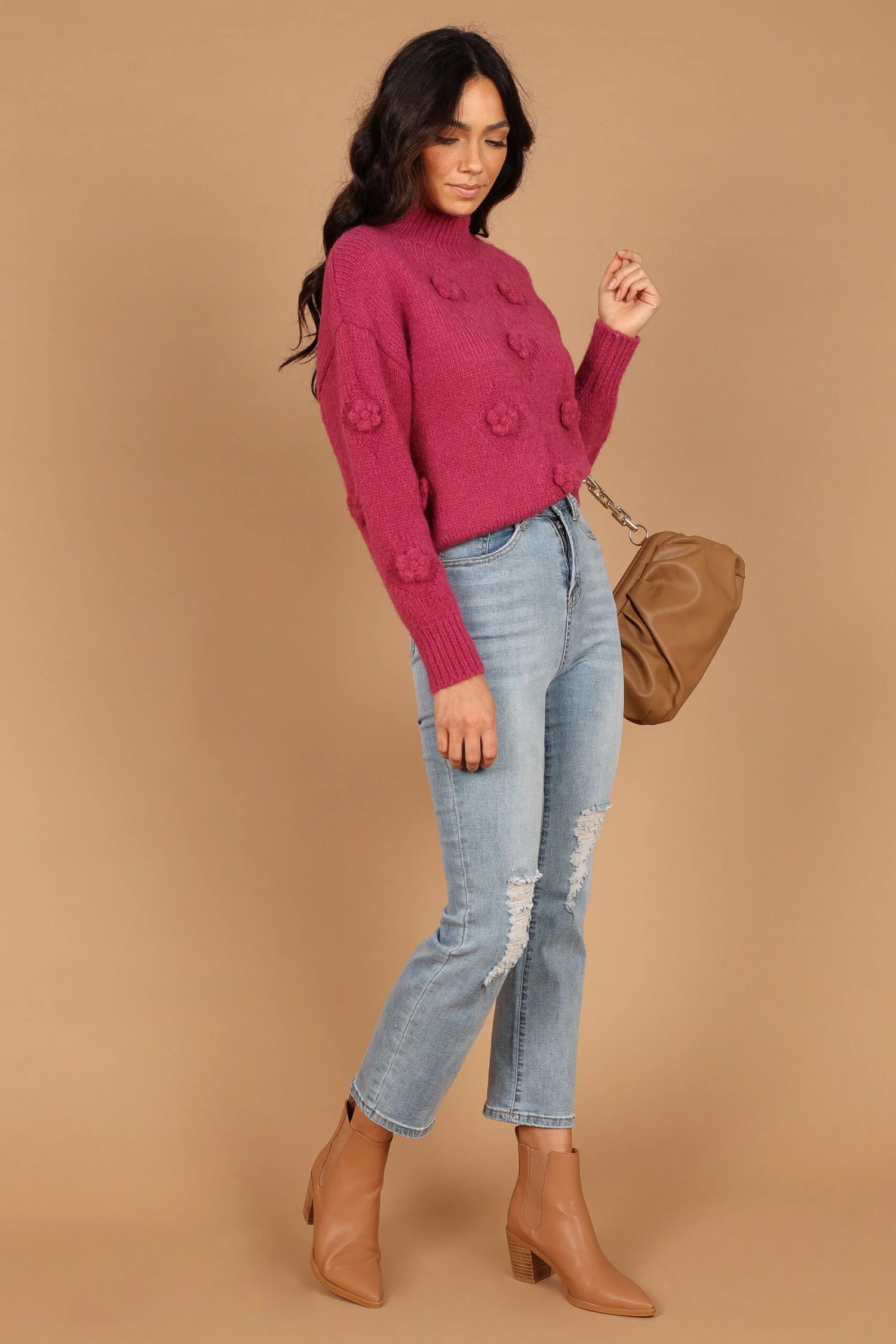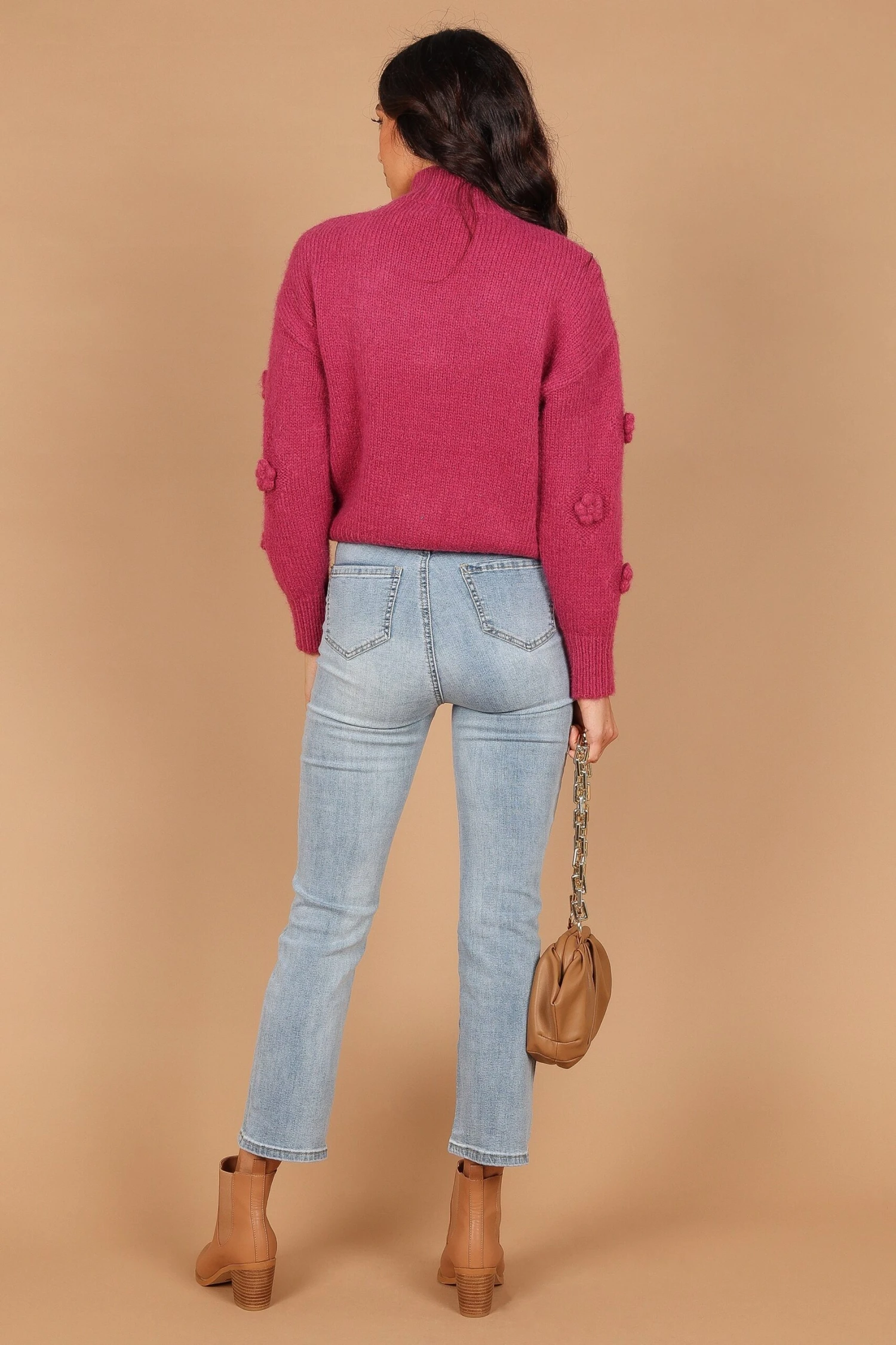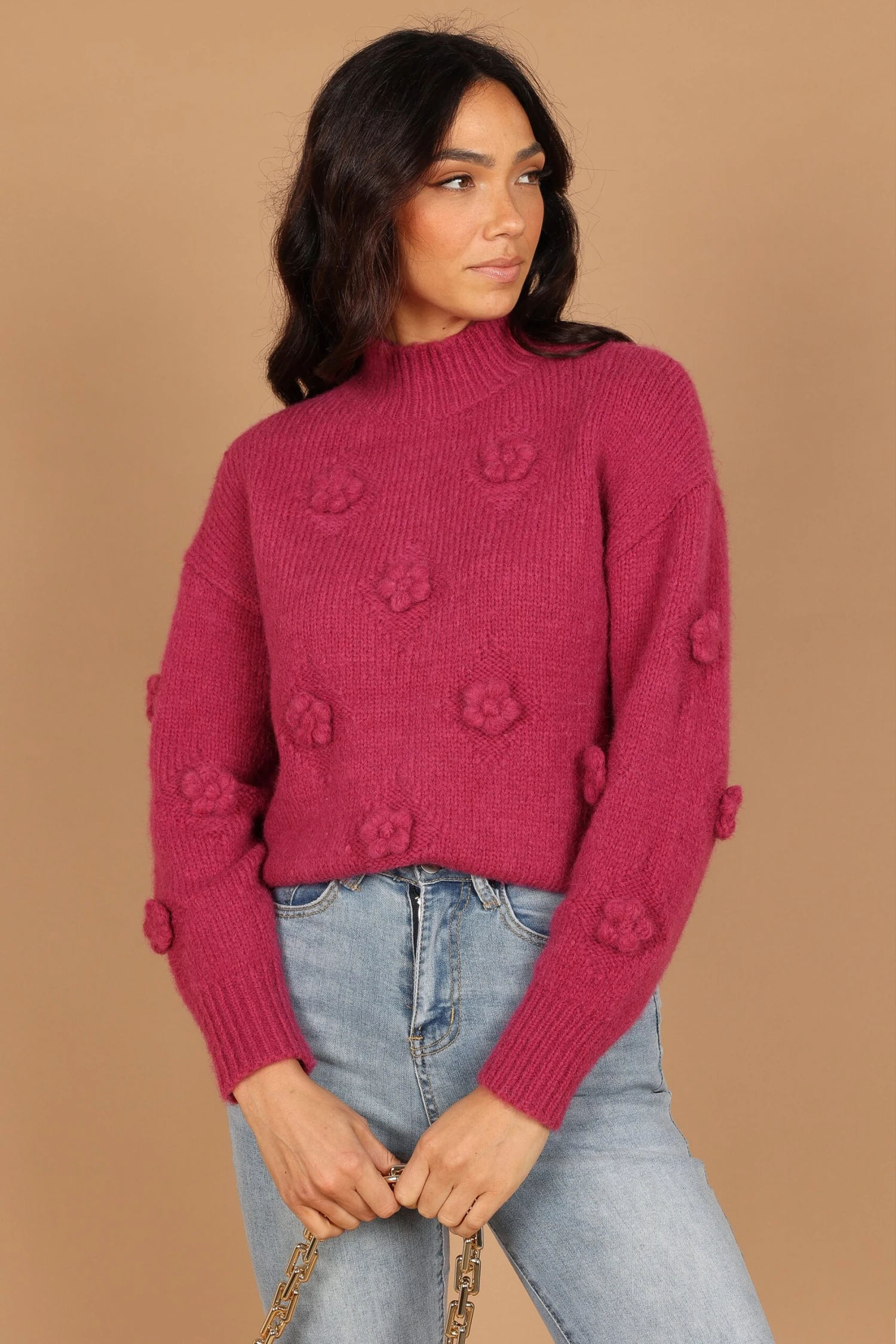 | DETAILS This knitwear sweater is the perfect thing to keep you warm and stylish this winter. With its high neckline, long sleeves with ribbed cuffs and flower detail, it’s sure to draw some admiring glances! The ribbed hem adds a little extra style, so all that’s left for you is to strut your stuff!